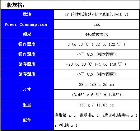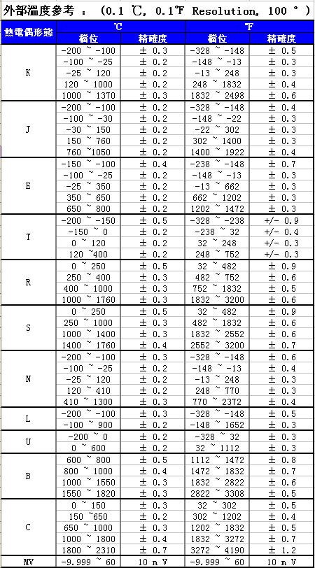 特點: 11型熱電耦 (K,J,E,T,R,S,N,L,U,B,C) 可℃ , ℉ , ? k , 輸出 解析度為 0.1 ℃ , 0.1 ℉ , ? k 內 /外溫度參考 溫度差值 , 溫度遞增/遞減量之功能 直接輸入數值 , 操作簡單